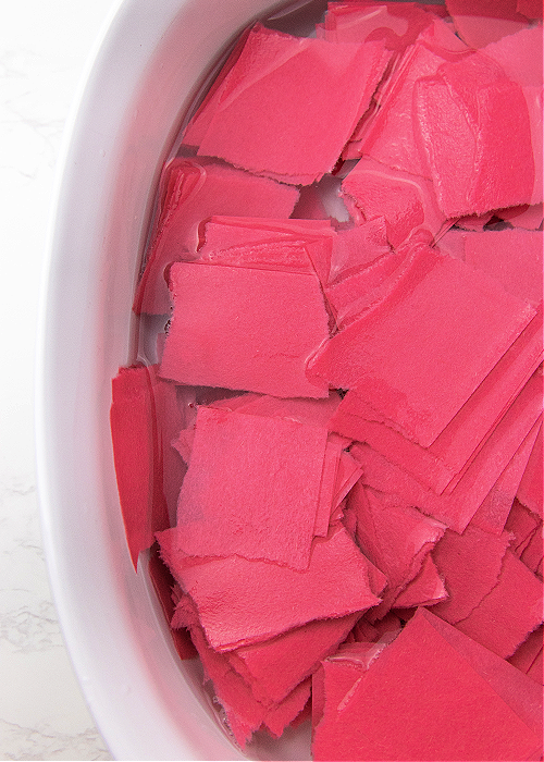After that, soak the squares in water for 1-2 hours. This will get the paper good and mushy, which will make it easy to turn into pulp in your food processor or blender! It doesn’t matter how much water you use; just be sure the paper is covered.