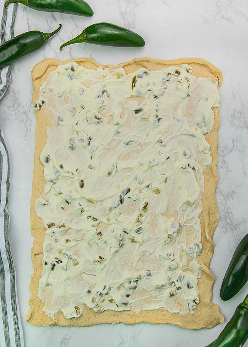 - Unroll and gently press out crescent dough sheet and spread the jalapeño cream cheese mixture over the dough.