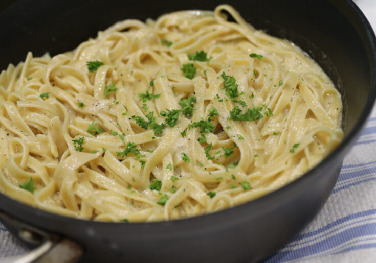 This Easy Alfredo Sauce Recipe is so simple and delicious. I also love that I can make this recipe in the amount of time it takes to boil noodles so it’s great for those nights where you’re short on time and you need an easy dinner idea!