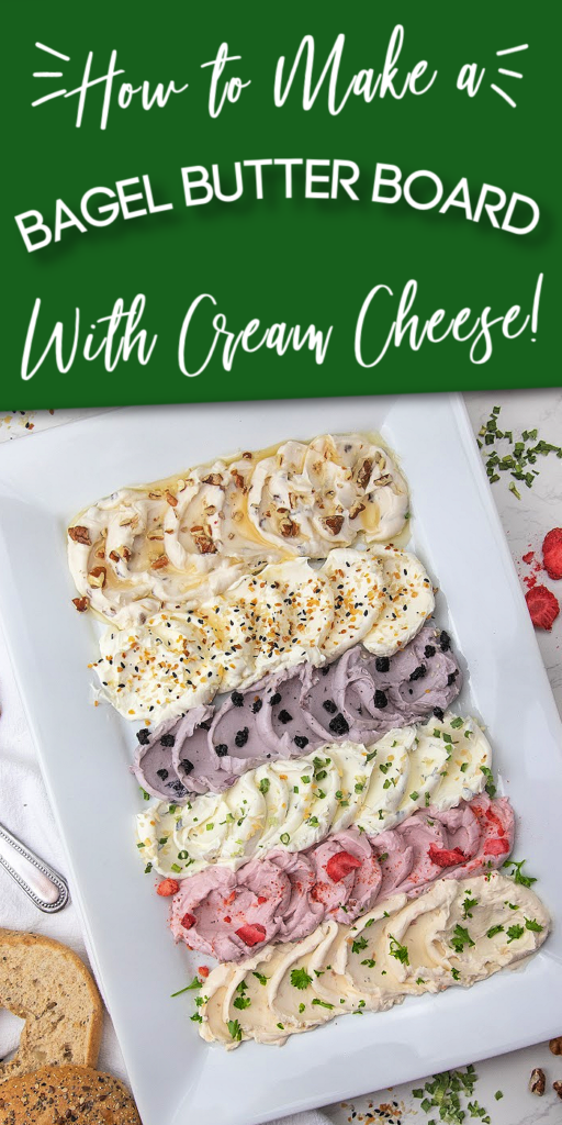 This Bagel Butter Board with Cream Cheese is a beautiful (and easy!) way to serve bagels and cream cheese to a crowd. Customize it with your own favorite cream cheese flavors and toppings!