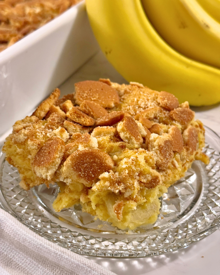 What makes these banana pudding brownies stand out is their simplicity! (I mean we all love a cake mix recipe, right?!) Using a yellow cake mix shortcut means no measuring flour or worrying about overmixing. The pudding mix infuses every bite with authentic banana cream flavor, while the fresh bananas add pockets of fruity goodness. Topped with chopped Nilla wafers, they deliver the perfect textural contrast: gooey center, crisp edges, and buttery crunch on top. No eggs or oil needed beyond what’s already in the mix- the pudding and milk create a thick, scoopable batter that bakes into moist, sliceable bars. I wasn’t sure what to expect when I first made them and they did NOT disappoint!