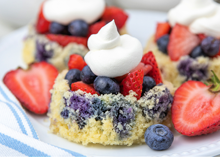 Blueberry Strawberry Shortcake is the perfect dessert for a summer picnic or any of the patriotic holiday gatherings throughout the warmer months. I love that the berries are baked right into the shortcake, too, for an added burst of flavor. The consistency of this shortcake is between a biscuit and a muffin and they taste amazing! They’re also super easy to make, too.