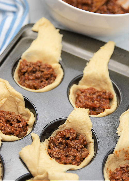 Place one crescent roll in each muffin cup. Press the dough into the muffin tin and against the sides to create a sturdy base for the Cheesy Sloppy Joe Bombs. Spoon approximately two tablespoons of sloppy joe mixture onto each crescent roll in the cup.
