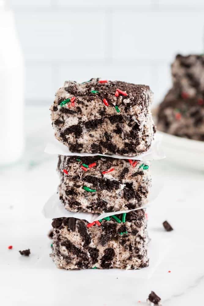 Festive, rich, delicious, and loaded with Oreo cookies in every single bite. Give this Christmas rice krispy treat a try for serving up an easy no bake dessert.