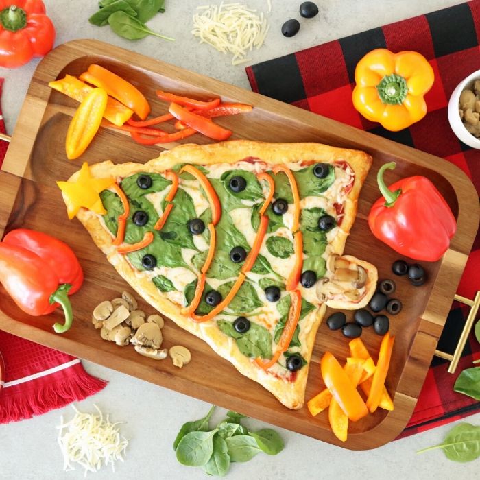 Red peppers, olives, mushrooms, shredded cheese, and more. Slice and serve a tasty dinner that gets you in the spirit of Christmas.