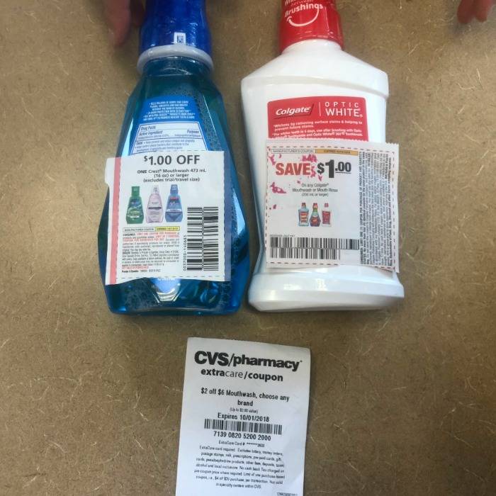 I ended up changing to buy one Colgate and one Crest Mouthwash, my total after coupons was $6.98 so the $2/6 coupon will work in that case because after manufacturer coupons the total is above the $6 threshold. There isn’t a 98% rule for CVS Coupons so you have to meet or be above that $6 mark in this instance.