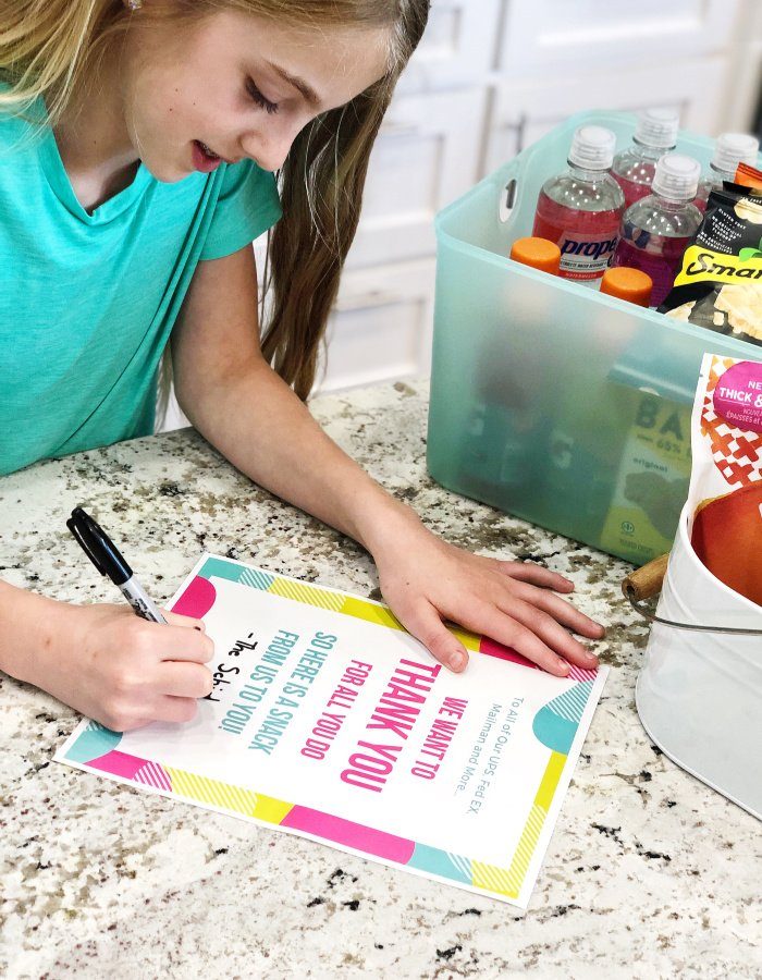 With everything going on we have been ordering online SO much more than we use to. And I know how hard all of the delivery drivers are working so we thought we would surprise them with a little thank you! Best of all my kids helped me make this! I love anytime they can help me give back to others. My daughter help me make the sign while the boys gathered up treats for our basket. They were all so excited to get it all put together and wanted it out on our porch as soon as possible!