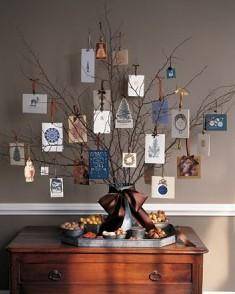 Arrange twigs in a vase and attach cards to each twig with ribbon. Attach a big bow to the vase for a more festive look. Cute way to dress up a dining room table or sofa table for the holidays.