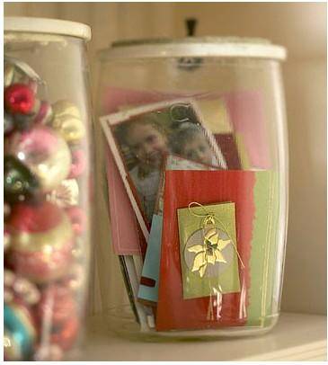 Find some cute clear canisters and use them to hold your holiday cards as well as holiday candies! Make a cute arrangement with same size or different sized canisters on a table or mantle.
