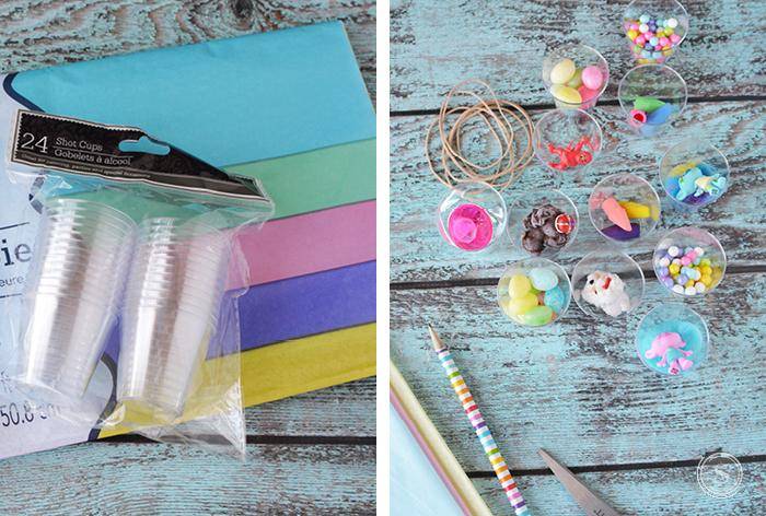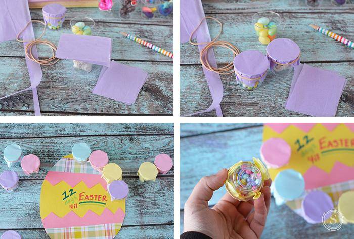 I was at the Dollar Tree and stumbled upon some inexpensive and pastel colored tissue paper and these cute little party cups. I grabbed some trinkets and candy and got work on my 12 days ’til Easter Countdown Calendar. Plus, be sure to check out even more Easter Crafts & Recipes!