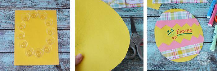 - Add some additional scrapbook and construction paper to the egg. Using a glue stick, glue paper on the egg and trim the excess with scissors. to keep the egg shape.