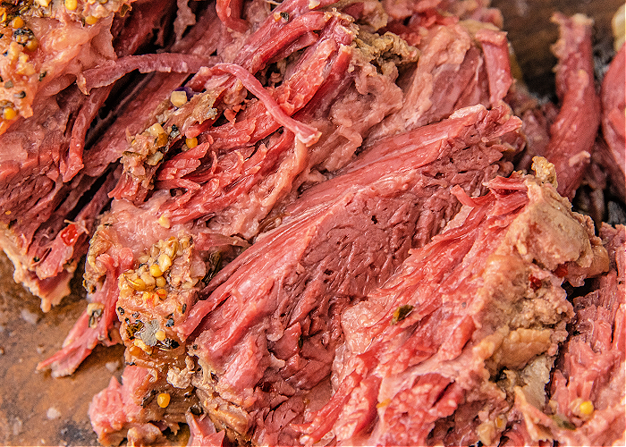 - Add the spice packet that came with the corned beef, minced garlic, pepper, and sugar to the top of the meat and rub in.