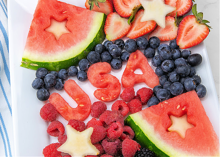 - Next, cut out a U, S, and A from watermelon and place the letters on the platter. Fill in all the spaces with the red and blue fruit.