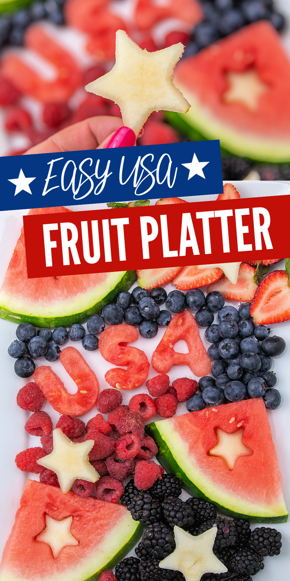 This USA Fruit Platter is as easy to make as it is festive to look at! Cookie cutters create cute star shapes and red white and blue fruit are perfect for all your patriotic holidays!