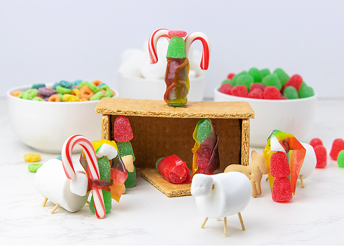 This Graham Cracker Nativity Activity for Kids combines graham crackers, fruit roll-ups, marshmallows, and other sweet treats to create an activity centered around the Christams story! Thisis perfect for all ages!