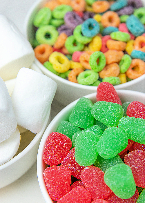 Next, create the figurines. Pictured above is the angel. For the figurines, I used three gumdrops secured together with a toothpick. (Use wire trimmers to clip off the excess toothpick on the end. After the gumdrops were secured together, I held the two candy canes together on the angel’s back to be the wings. Lastly, I cut up a Fruit Roll-Up and wrapped it around the angel, securing the wings in place. after placing the angel on the stable, I added a Fruit Loop halo!