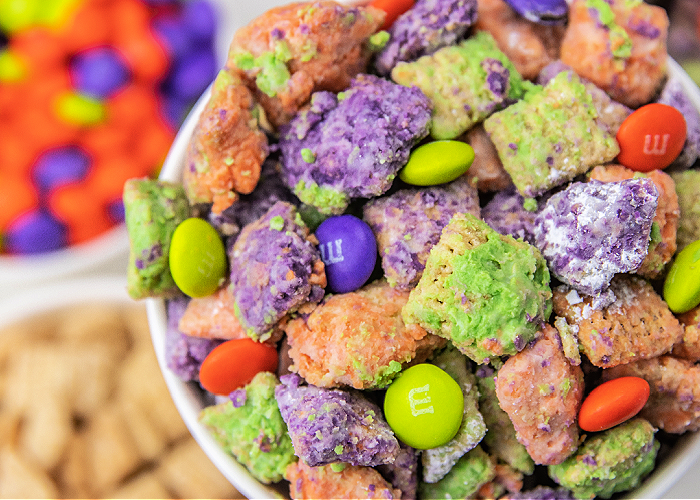 This puppy chow is a fun combination of Halloween colors with a taste that you know and love!