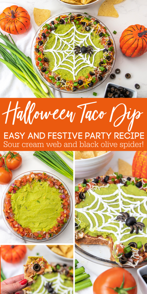 This Halloween layered taco dip combines all the flavors you love with a festive spiderweb and black olive spider on top!