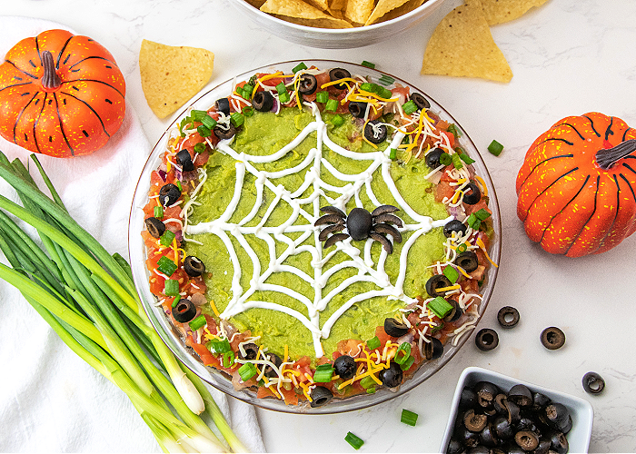 This Halloween layered taco dip combines all the flavors you love with a festive spiderweb and black olive spider on top!