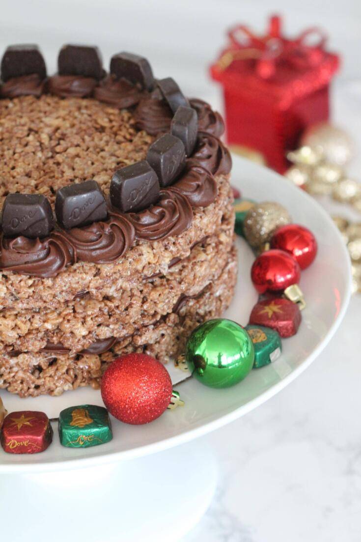 Every year during the holidays I’m always looking for super simple recipes to make to take to family gatherings and parties. The holidays are a really busy time around here on the blog so having a no bake recipe that’s easy to assemble makes my life so much easier! My entire family loves Rice Krispies treats, so I thought it would be fun to use these NEW DOVE Tree-ts from Target as inspiration in this Holiday Rice Krispies® Treat™ Cake with Pillsbury™ Frosting! Plus I wanted to try the Pillsbury™ Filled Pastry Bag to add some simple but decorative touches on the top of my cake!