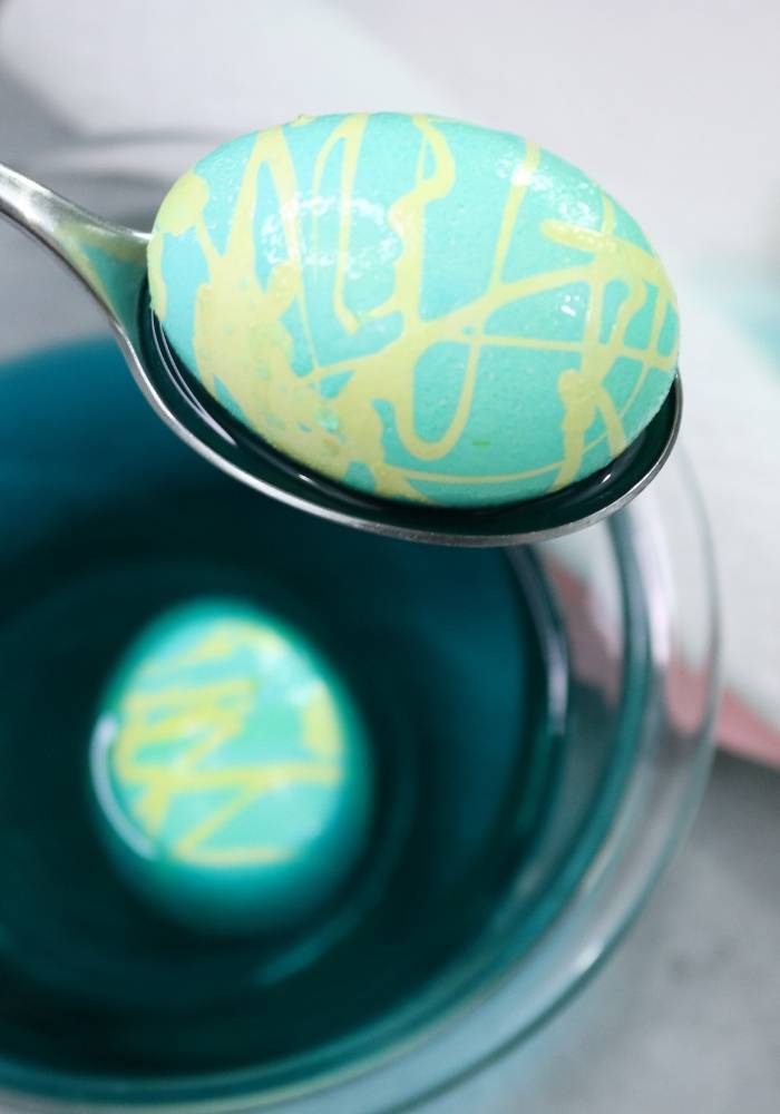 Once the rubber cement is dry or sticky, you can place the eggs in the darker color of dye. The eggs will stay the lighter color where the Rubber Cement is, and the rest of the egg will dye the darker color creating a swirl and marbleized effect!