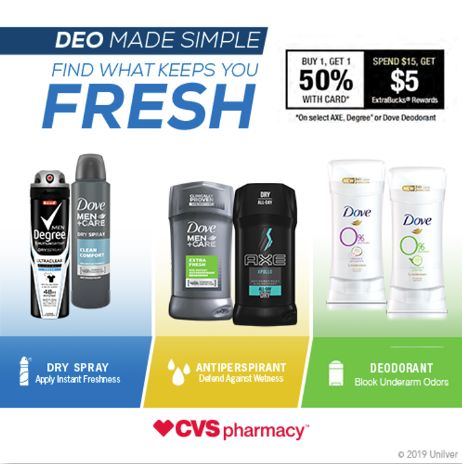 CVS is working with AXE, Dove, and Degree to offer you B1G1 50% Off Deal on Deodorant that STACKS with a Spend $15, get $5 ExtraBucks deal!!