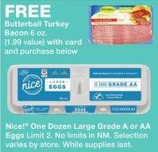 Through 5/12/18 Walgreens is offering FREE Butterball® Turkey Bacon 6 oz packs (reg $1.99) with the purchase of NICE!® One Dozen Large Grade A or AA Eggs (limit 2). Egg pricing may vary by region but they are generally priced at $1.99 each. Buy 1 NICE!® Dozen Eggs and 1 Butterball® Turkey Bacon 6 oz pack paying $1.99 out of pocket after sale deducts the bacon price. That is only $0.99 per product!!