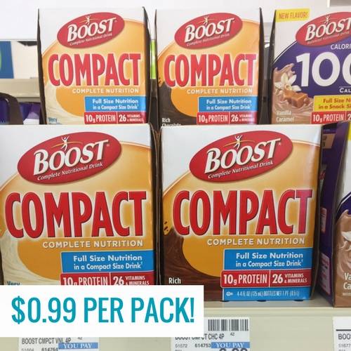 Through 1/20/18 CVS is offering $10 in Extra Care Bucks when you buy 4 Boost Nutritional Drink Packs with pricing starting at $6.99 each. Buy 4 packs and use 2 of the $7.00/2 Boost Nutritional Drinks coupons from 1-7-18 Redplum Insert. You’ll pay as low as $13.96 out of pocket and earn $10 in Extra Care Bucks making it $0.99 per pack!