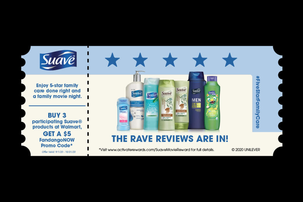 Disclosure: FANDANGONOW PROMOTIONAL CODE FULL TERMS AND CONDITIONS: *While supplies last. Must be 18 or older to participate. FandangoNOWPromotional Code (“Code”) is good towards the rental of any movie (any format) on FandangoNOW.com and via participating FandangoNOW apps (up to $5 total value). Taxes may apply. Code expires on 10/31/20. You must have a Fandango VIP account to redeem your Code. Fandango VIP is free to join. Credit card may be required for transactions on FandangoNOW.com. Code must be redeemed to your Fandango VIP account or entered at checkout to receive discount. One Code per transaction. Limit 1 Code per household. No manual reproductions will be accepted. One Code per receipt submission. Must be a resident of the U.S. If lost or stolen, cannot be replaced. No cash value, except as required by law. Not valid with any otheroffer. One-time use only. Not for resale; void if sold or exchanged. If the cost of rental of content is more than maximum value of the Code,then user must pay the difference. Any price difference between cost of purchase or rental and maximum value of the Code will not be refunded. Offer valid in U.S. and D.C., excluding U.S. territories and where prohibited by law. Fandango and Fandango Loyalty Solutions, LLC are not a sponsor or co-sponsor of this offer. The redemption of the Code is subject to Fandango’s Terms and Policies at www.fandango.com/terms-and-policies. See www.activaterewards.com/SuaveMovieReward/details for full details. FANDANGONOW and the Fandango Logo are trademarks of Fandango Media, LLC.
