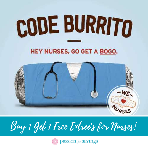 Nice! This Tuesday 6/4 only, nurses can get Chipotle Buy 1, Get 1 Free Entrees without using any coupons! See more Restaurant Coupons that we have available.