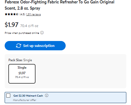 We have a nice freebie on Febreze Products this week at Walmart! Walmart has the Febreze Odor-Fighting Fabric Refresher To Go Gain Original Scent, 2.8 oz. Spray priced at $1.97 each. Through 9/15/24, get $2.30 in Walmart Cash back after purchase! Limit 1 per transaction. That means you get it for FREE after Walmart Cash!! Make sure you click the box before you make your purchase to claim your cash back!