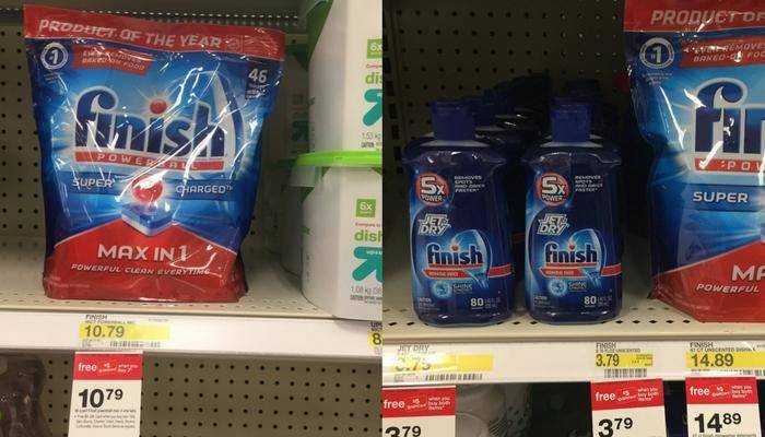 Through 9/9/17 Target is offering a FREE $5 Target gift card when you buy one select Finish Dishwashing Product plus one Finish Rinse Agent. The Finish Powerball Quantum Max 45 count bags are priced at $10.79 and the Finish Jet Dry Rinse Agent is priced at $3.79. Buy 1 of each and use $1.00/1 Finish Quantum Max Coupon and $1.00/1 Finish Jet Dry Rinse Coupon paying $12.58 out of pocket. You will receive a $5 Target gift card at checkout making it only $7.58 for both products!