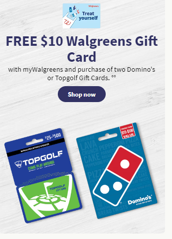 Through 8/10/24, Walgreens® is offering a FREE $10 Walgreens® Gift Card when you purchase any 2 Top Golf or Domino’s Gift Cards. Simply buy 2 of your favorites included plus a $10 Walgreens® gift card. The $10 gift card will be Free! This is an in-store deal. Limit 2 per person.