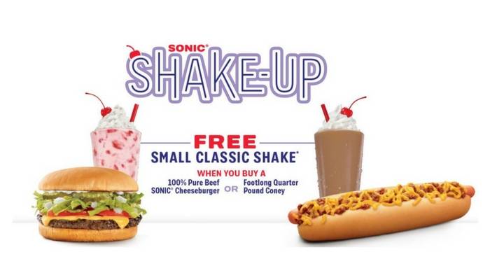 For a limited time you can get a Free Small Classic Shake when you purchase at regular price a 100% Pure Beef Sonic Cheeseburger or Footlong Quarter Pound Coney. No coupons required!