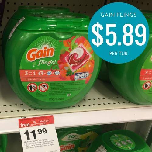 If you prefer the Gain Flings you’ll pay a bit more but you’ll use all the same coupons. Target has the 42 count Gain Flings on sale for $11.99 each plus you’ll earn a $5 Target Gift Card when you buy two. Buy 2 and stack this 5% Off Gain Laundry Detergent Target Cartwheel Offer (exp 10/14/17) with 2 of the $3.00/1 Gain Flings or Gain Laundry Detergent coupon from 10-8-17 Redplum Insert. You’ll pay $16.78 out of pocket and earn a $5 Target gift card making it $5.89 per tub!
