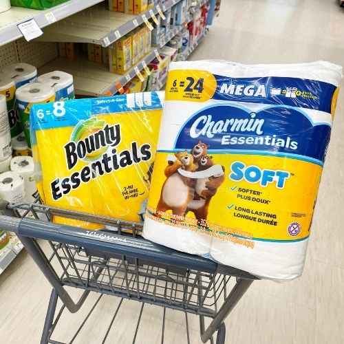 One specific deal that I love is the Buy 4 Bounty/Charmin Essentials Products, Get $6 in Register Rewards. This is a great price on paper towels and bath tissue! Here are two different ideas for you!