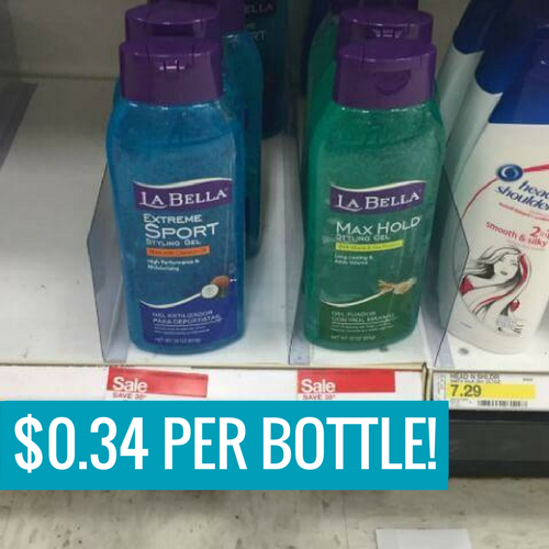 Target carries the 22 oz bottles of La Bella Styling Gel for $1.84 each regular price. Buy 1 bottle and use this $1.50/1 La Bella Product Coupon paying just $0.34 out of pocket! Super easy deal!