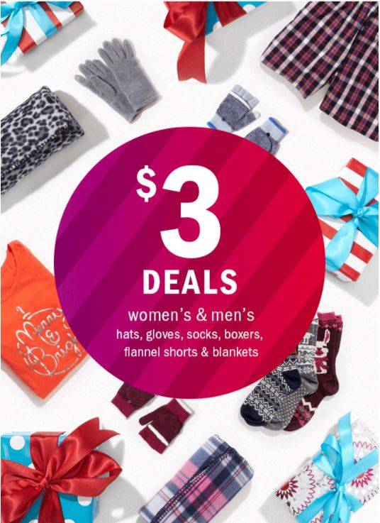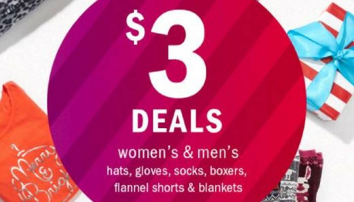 Through today only 12/21/17 you can grab $3 Deals on women’s & men’s hats, gloves, socks, boxers, flannel shorts & blankets!! This is in-store but if you want to check the up to 75% off deals online go here!