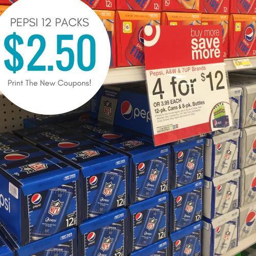 This week Target has all Pepsi 12 pack cans or 8 pack bottles on sale 4/$12! If you buy 4 and use 2 of the $1/2 Pepsi 12 Packs Coupons, you will pay just $10 for 4 which is $2.50 per 12 pack!