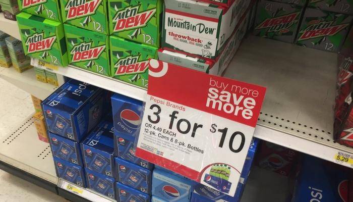 Through 9/16/17 Target has Pepsi Brand Products, including Pepsi and Mt. Dew 12 pack cans and 8 pack bottles on sale 3/$10. In addition, there is in ad coupon for a $5 off when you spend $20 or more on select beverages. You can also get it on your phone by texting PEPSI to 827438. Buy 6 Pepsi 12 packs and use the $5 in ad coupon making it $15 for all or just $2.50 per 12 pack!