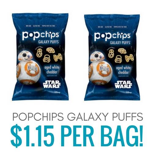 Through 2/17/18 Target has the 4 oz bags of PopChips Galaxy Puffs Snacks on sale 2/$6 or $3 each. Buy 2 bags and use this 20% off PopChips Target Cartwheel Offer (exp 2/10/18) paying $4.80 out of pocket. You can then redeem the $2.50/2 Popchips Galaxy Puffs – Checkout 51 Rebate; Limit 3 making them $1.15 per bag!