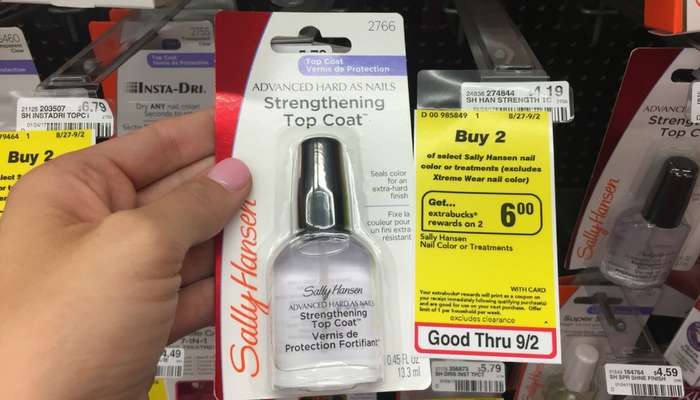 Through 9/2/17 CVS is offering $6 in Extra Care Bucks when you buy two select Sally Hansen Nail Color or Treatment items. The Sally Hansen Hard As Nails Top Coat is priced at $4.19 each at my store, however pricing does vary on this product and you may find it cheaper! Buy 2 Sally Hansen Hard As Nails Top Coat and use 2 of the $1.00/1 Sally Hansen Nail Care Product coupons from 7-23-17 Redplum Insert. You’ll pay $6.38 out of pocket and earn $6 in Extra Care Bucks at checkout making it only $0.19 per bottle!