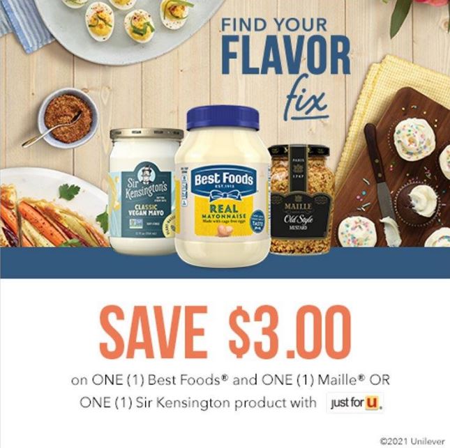 Right now, you can save on condiments at Albertsons or Safeway stores! Save $3 on One (1) Best Foods and One (1) Maille or One (1) Sir Kensington’s product with your Just for U account!