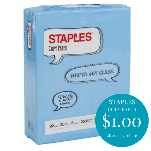 One of my favorite Back to School sales are the stock up paper deals! You can get a BIG stack of Staples Copy Paper 750 Sheet Pack for just $1 after Rebate!