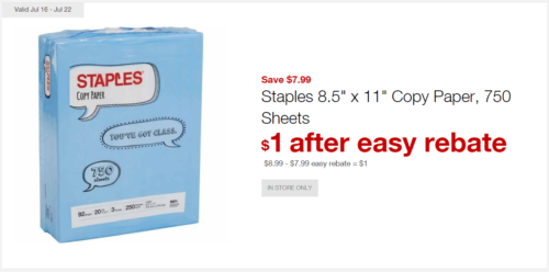Through 7/22/17 Staples has their 8.5″x11″ Copy Paper 750 Sheet packs are on sale for $8.99 each then you can redeem this $7.99 easy rebate making it only $1 after easy rebate! You’ll pay $8.99 out of pocket and then you can redeem the rebate on your receipt and get back $7.99 in your easy rebate.