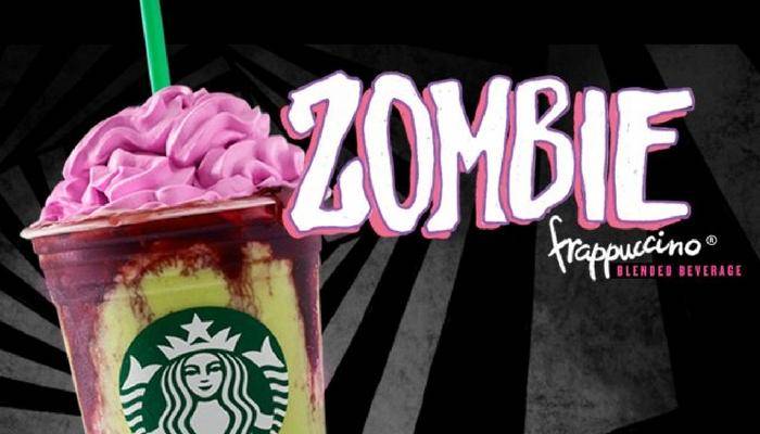 The Starbucks Zombie Frappuccino is flavored with green caramel apple, a drizzle of dark mocha, and pinkish whip. You will find them at participating stores. While supplies last!