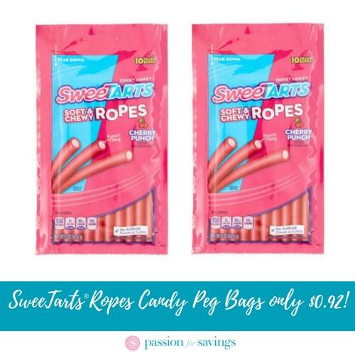 Through 4/7/18, Walgreens has the 5 oz peg bags of SweeTARTS Soft & Chewy Ropes Candy on sale 3/$5. Buy 3 peg bags and use 3 of the $0.75 on Any ONE (1) SweeTARTS®, SPREE® or NERDS® peg bag (4.5-7oz) paying $0.92 out of pocket.