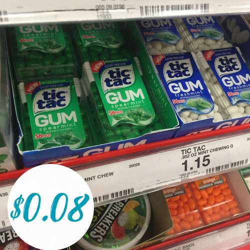 Target carries the 0.952 oz 56 count Tic Tac Gum priced at $1.15 each regular price. Through 6/2/18, buy 1 pack and stack this 50% off Tic Tac Gum Singles Target Cartwheel Offer with this $0.50/1 Tic Tac Gum coupon from the 4-8 Smart Source Inserts making it only $0.08 out of pocket. Pricing does vary by region.