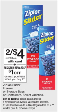 Starting 8/20/17 through 8/26/17 Walgreens will have Ziploc Bags on sale 2/$4 plus you’ll earn $1 in Register Rewards at checkout when you buy 2. By 2 boxes and use this $1.00/2 Ziploc brand bags paying $3 out of pocket. You’ll earn $1 in Register Rewards at checkout making it only $1 per box!