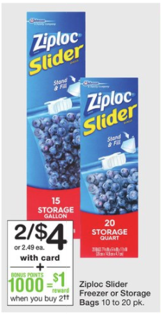 Starting 2/25/18 through 3/3/18 Walgreens will have the 10-20 count boxes of Ziploc Bags for 2/$4 plus you’ll earn 1,000 Bonus Points ($1) when you buy 2. Buy 2 boxes and use this $1.00/2 Ziploc Brand Products printable paying $3 out of pocket. You’ll earn $1 in points making it only $1 per box!